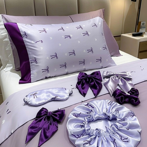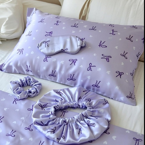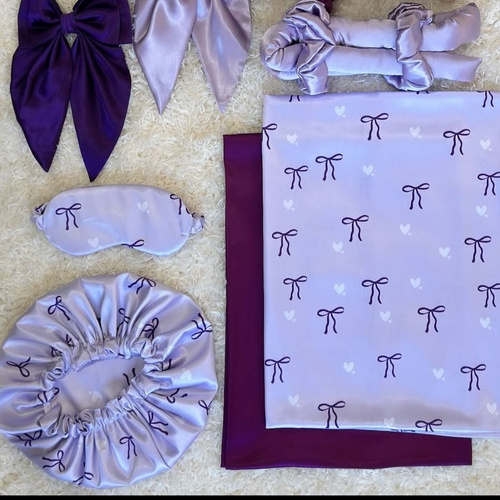 پک ساتن روبالشی کلاه خواب چشمبند اسکرانچی جنس ال ایکس وارداتی طرح پاپیون بنفش
